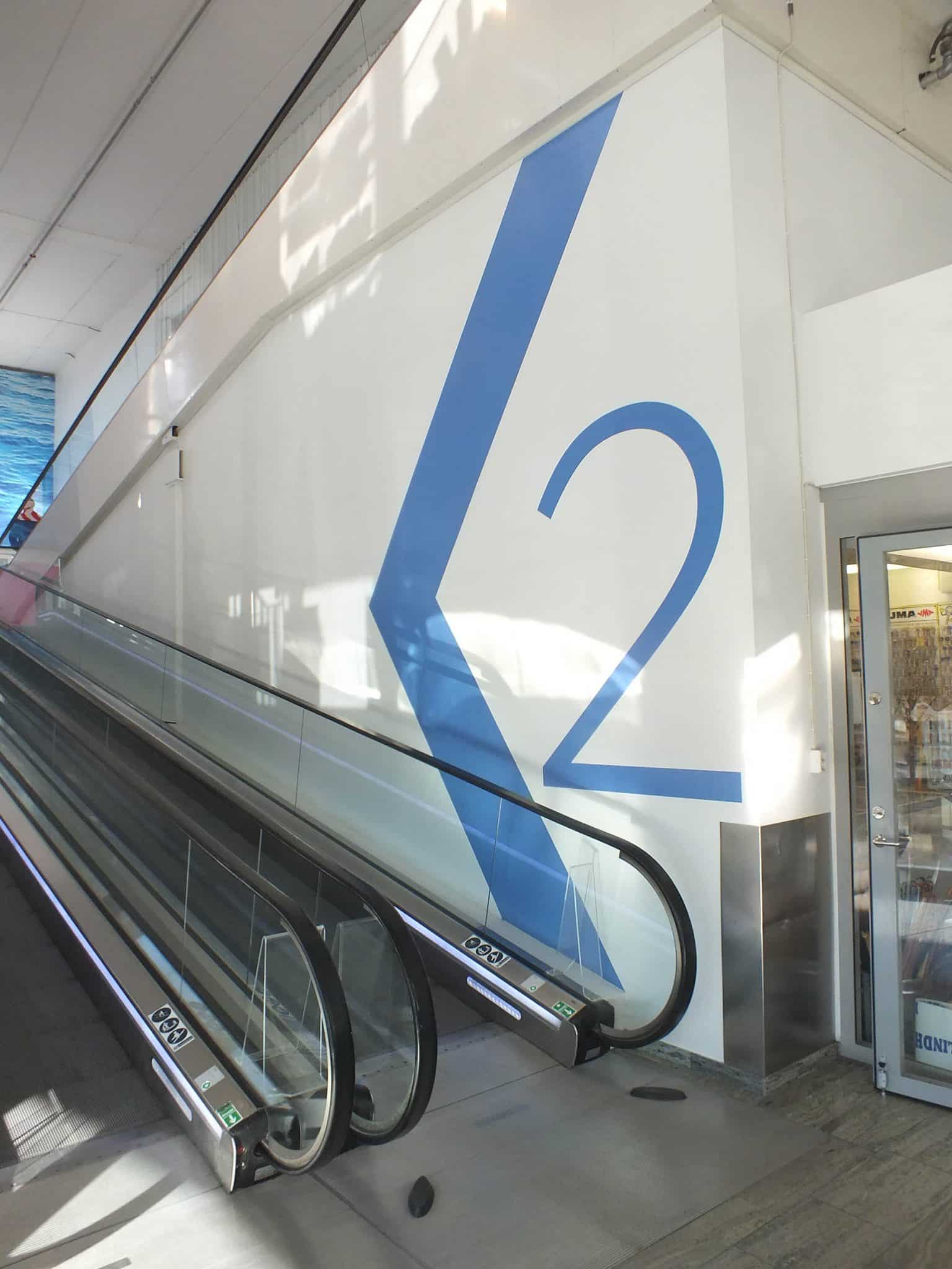 På en gallertrappa är det för liten yta för att montera folier, men för att markera våningsplanen tydligt och undvika halka kan särskilda plåtmarkeringar skruvas fast.